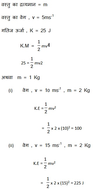 प्रश्न 3: 5 ms-1 के वेग से गतिमान किसी m द्रव्यमान की वस्तु की गतिज ऊर्जा 25J है | यदि इसके वेग को दोगुना कर दिया जाए तो इसकी गतिज ऊर्जा कितनी हो जाएगी | यदि इसके वेग को तीन गुना बढ़ा दिया जाए तो उसकी गतिज ऊर्जा कितनी हो जाएगी |
