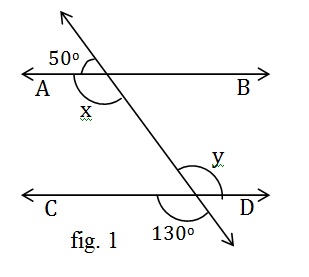 Q2. fig. 1, find the values of x and y and then show that AB || CD.