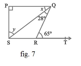 देखिये आकृति 7, यदि PQ ⊥ PS, PQ || SR, ∠ SQR = 28° और ∠ QRT = 65° हैं तो x और y का मान ज्ञात कीजिये |